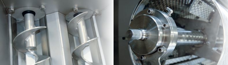 With the KEP 650 and KEP 1000 models, care should be taken not to overfill the machine to ensure a quick and clean separation of the fruit pulp and stone. In the KEP 1500 and KEP 2500, the intake is automatically regulated by two dosing screws, which are controlled by a current monitoring relay.